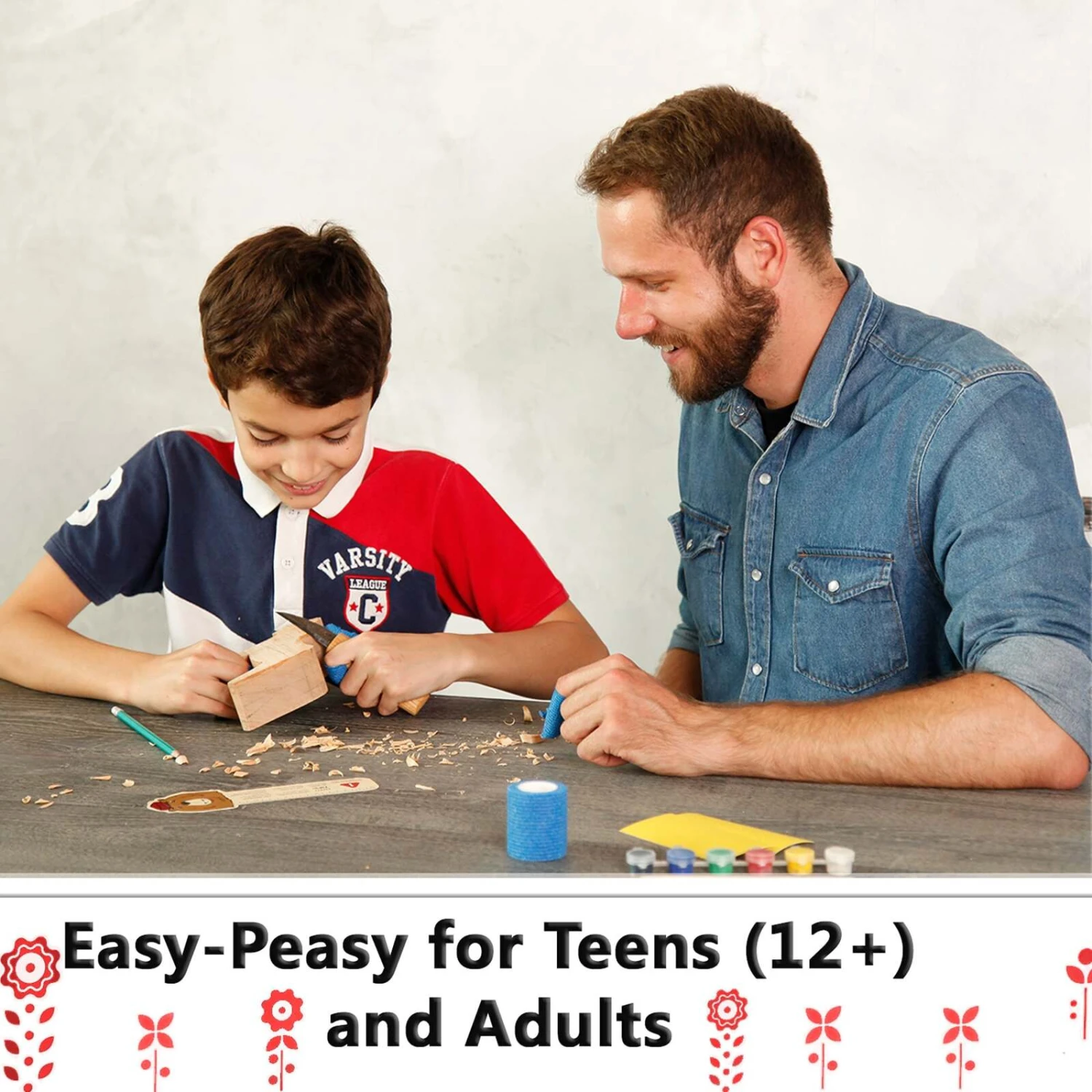 The BeaverCraft DIY02 Dala Horse Carving Hobby Kit has everything you need to start carving right away. Here you will find a wooden horse blank, a whittling knife, paints, paintbrush, pencil, sharpening essentials (leather strop and polishing compound), safety tape, and sandpaper. A perfect gift for your family and friends!