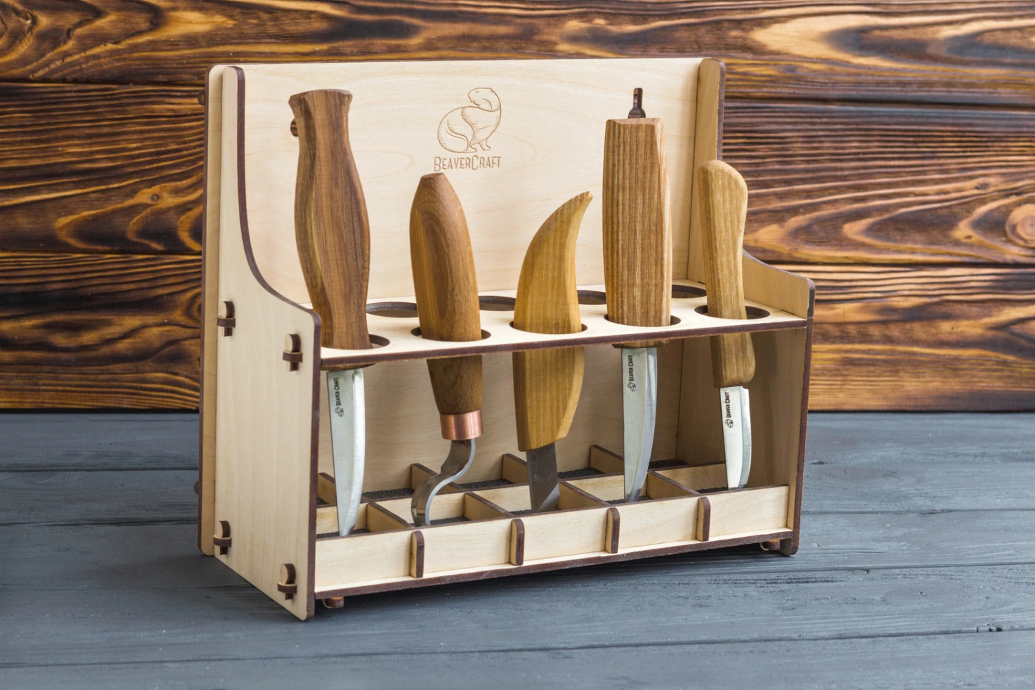 A must for any woodcarver, the tool holder will look wonderful in your workspace. You can either hang the tool holder on a wall or place it on a horizontal surface. The wooden holder is easily assembled without tools, glue or screws.