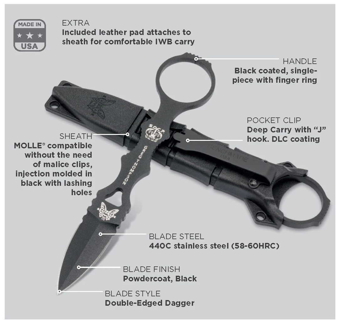 Taking the best features of its full sized counterpart, Benchmade have again teamed up with Greg Thompson to optimise some of the most popular elements of the SOCP platform with the 173BK Mini SOCP. Updated design of the sheath clip allows for better retention on MOLLE webbing, pocket seams and waistbands. Allows the user to maintain dexterity and manipulate other objects without putting down the knife.