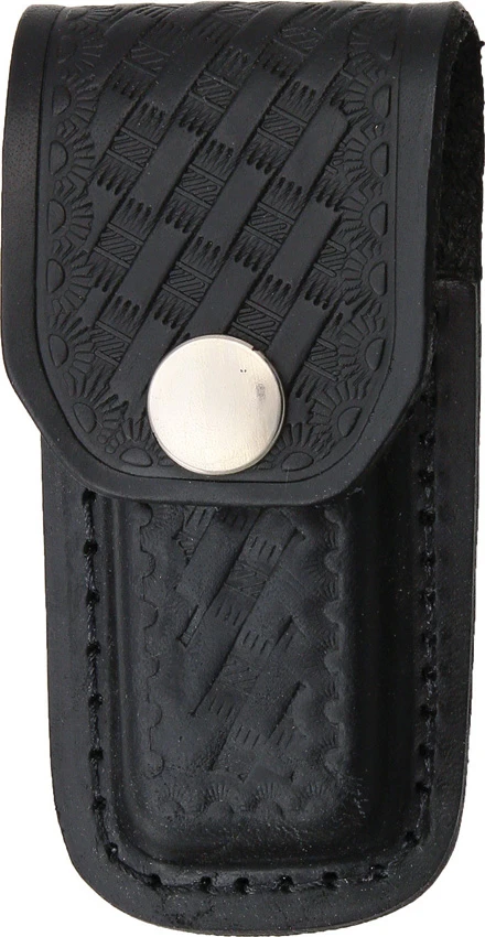 Black leather with embossed basketweave pattern. Suitable for any folding knife of approximately 3″ to 3 1/2″ long.