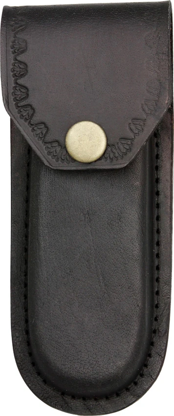 Black Leather with embossed edge pattern. Fits most 5″ folding knives. Snap closure.