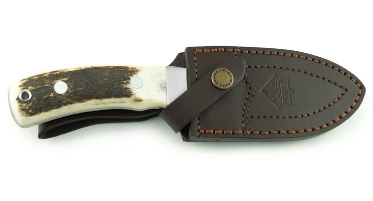 The transition to the handle area is formed by a hand guard with bolsters made of nickel silver, classic stag horn was chosen for the scales. The eyelet at the end of the handle can be used to attach a safety strap. With a weight of 285 g and a total length of 23.5 cm, the PUMA IP Wild Boar is not exactly a “lightweight”, but the dimensions are just right for the intended use. Included is a neatly finished leather sheath that holds the knife securely for transport. Awarded the “Golden Keiler” by Jäger magazine in 2012.